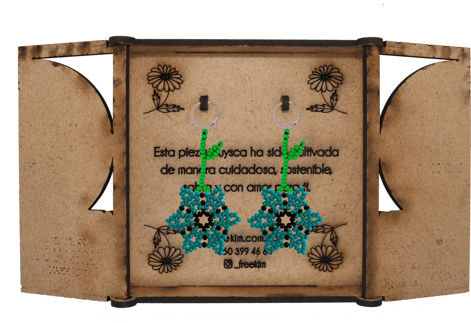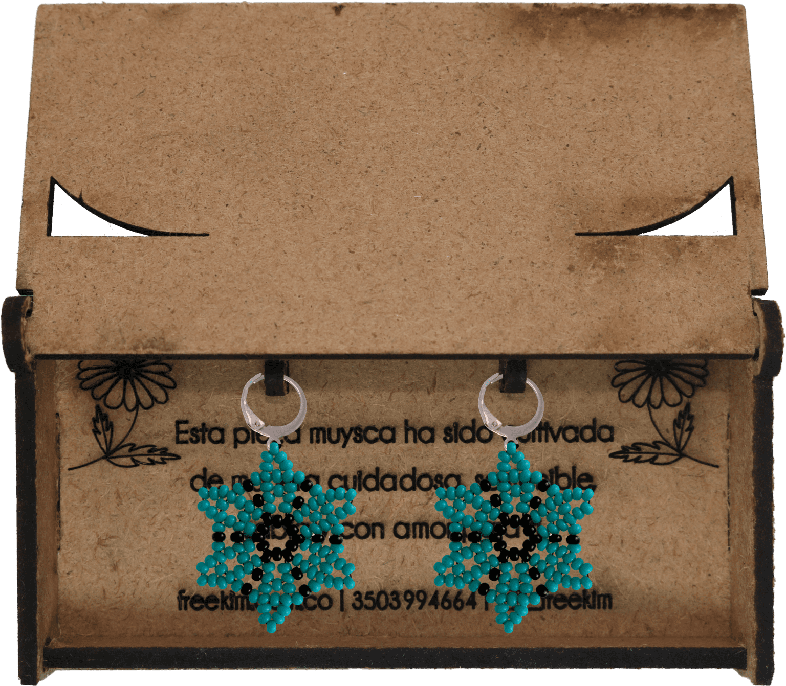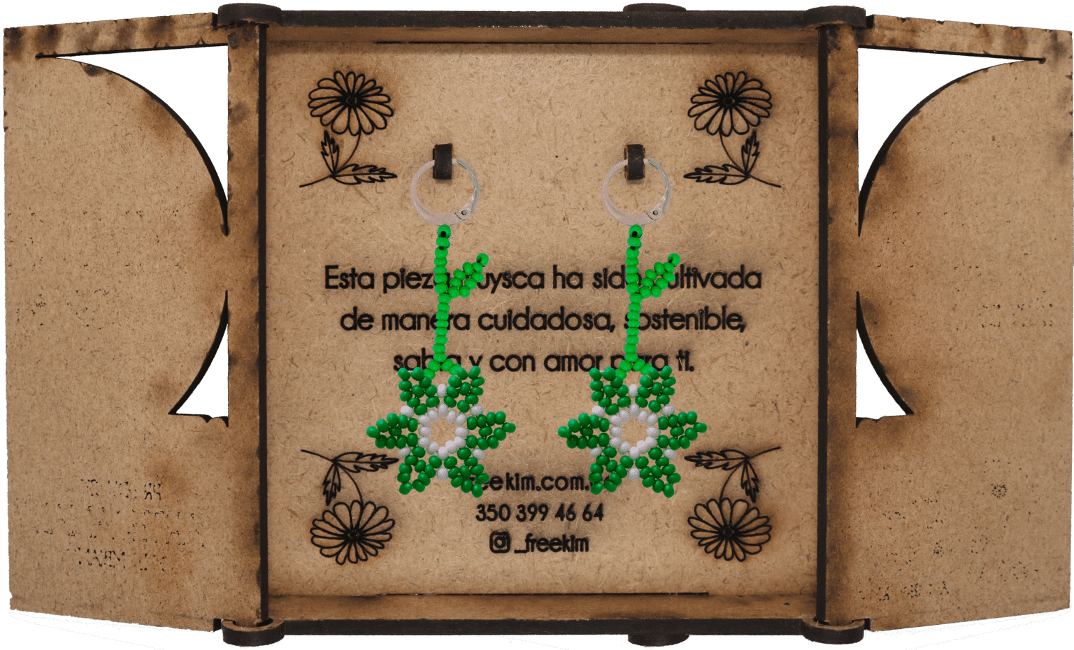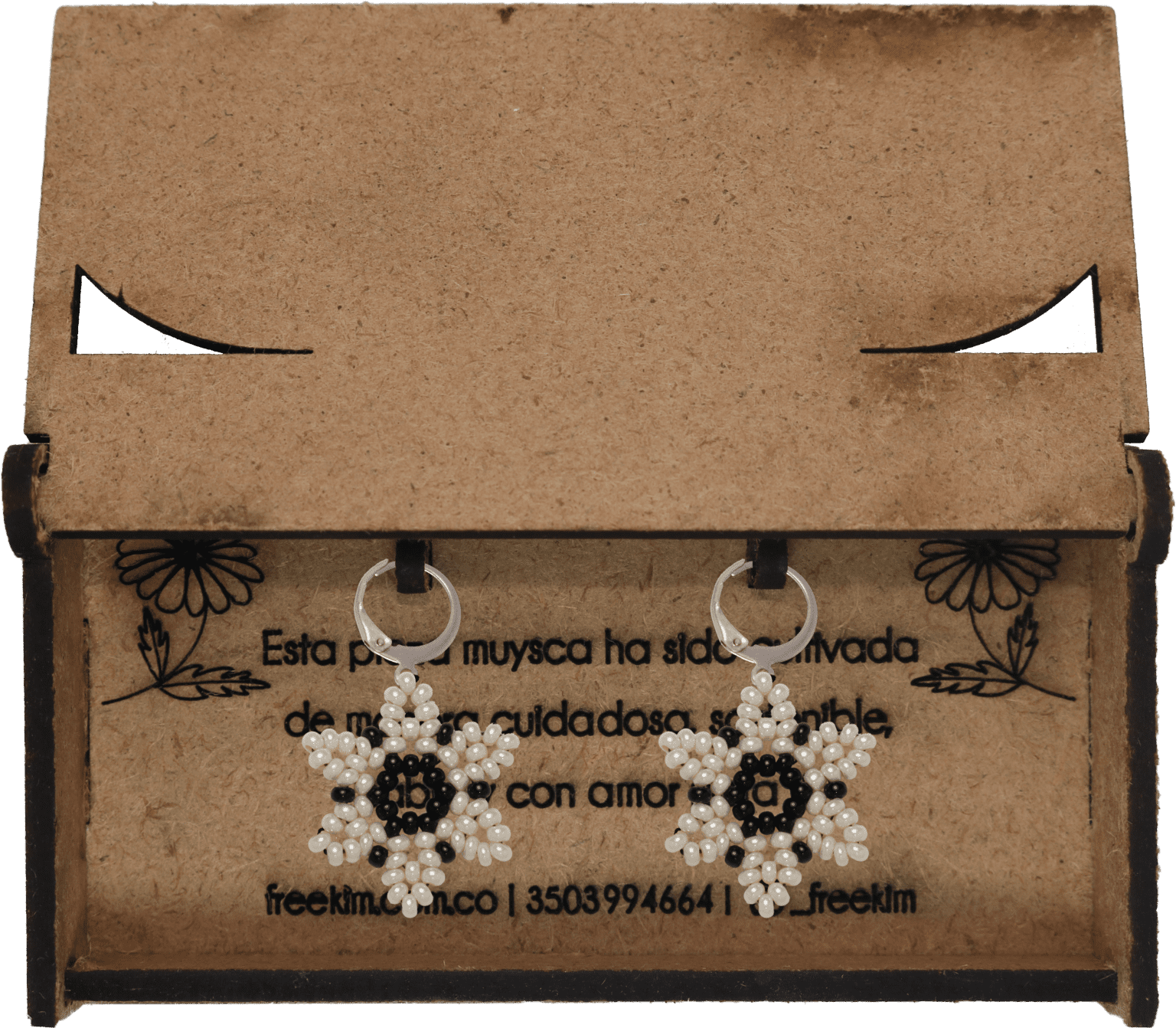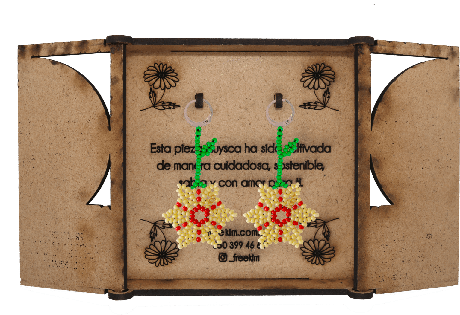 Ganchos en acero inoxidable, mostacilla checa, hilo resistente y cajas en madera.
