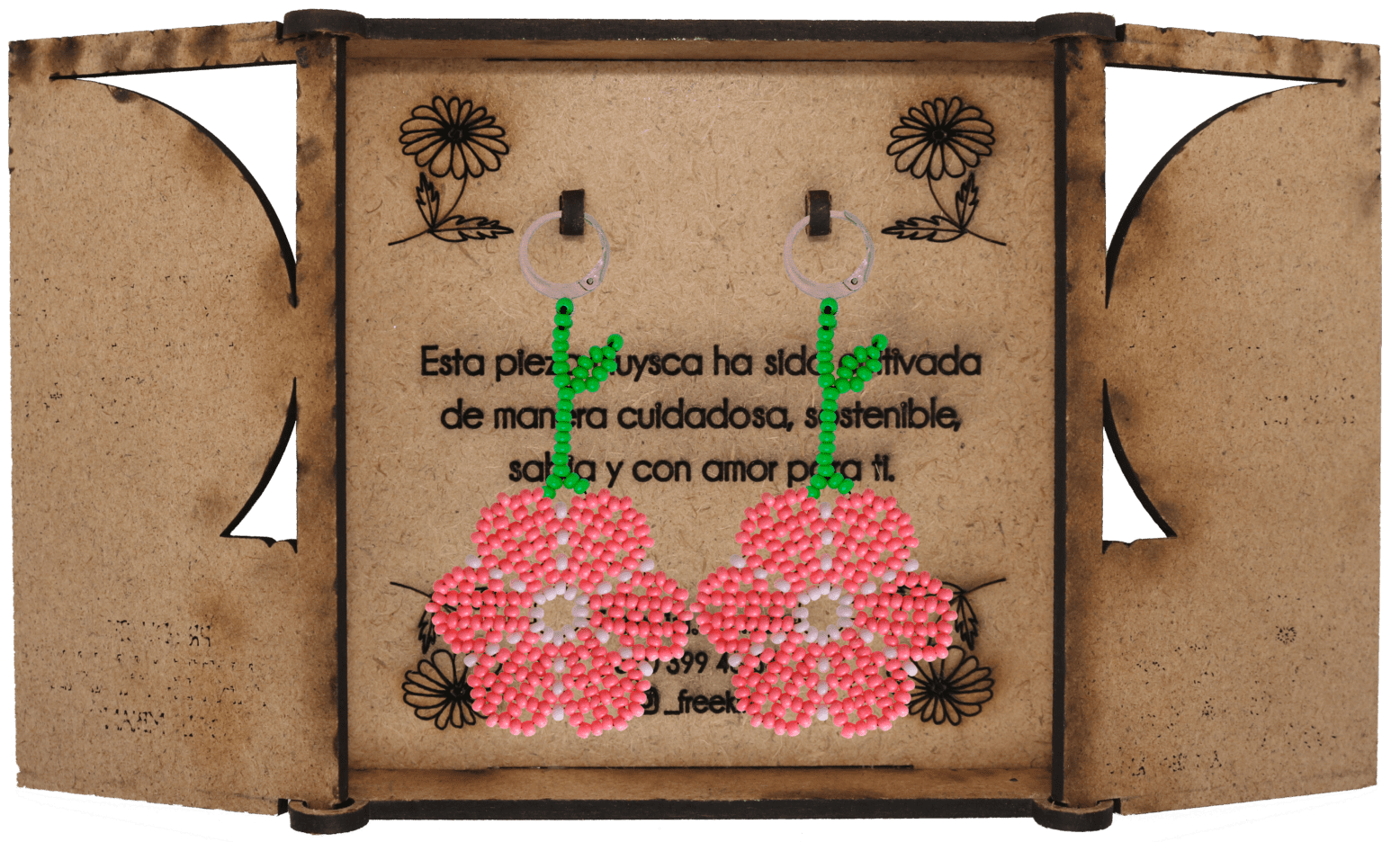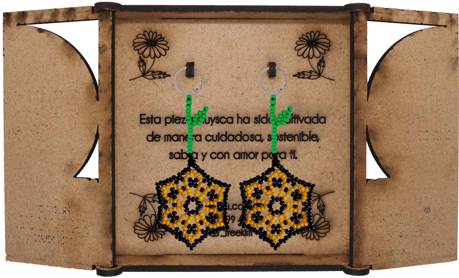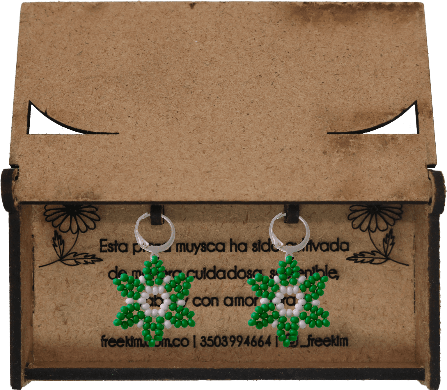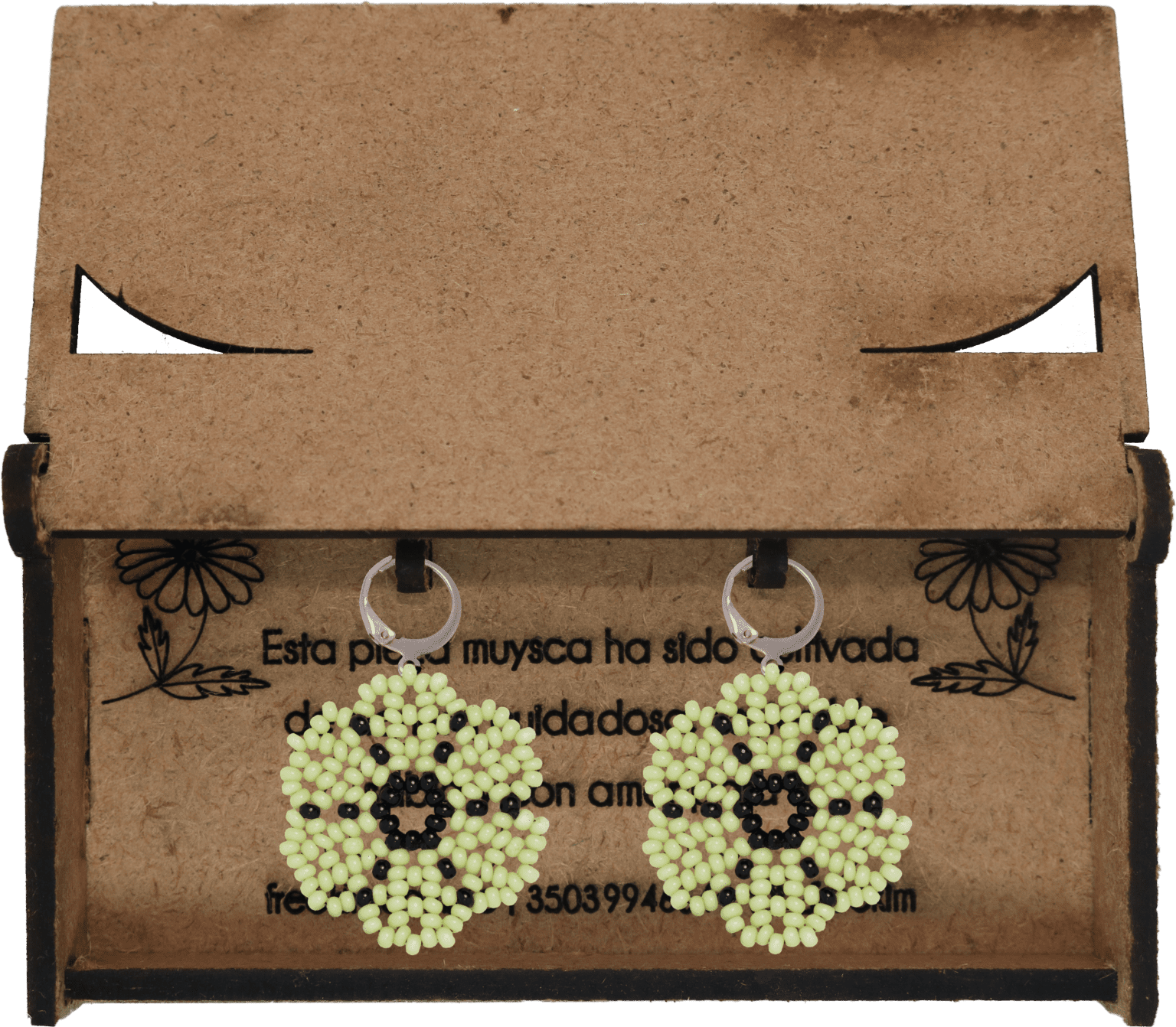 Ganchos en acero inoxidable, mostacilla checa, hilo resistente y cajas en madera.