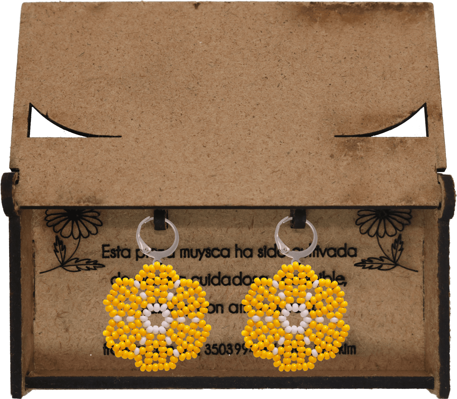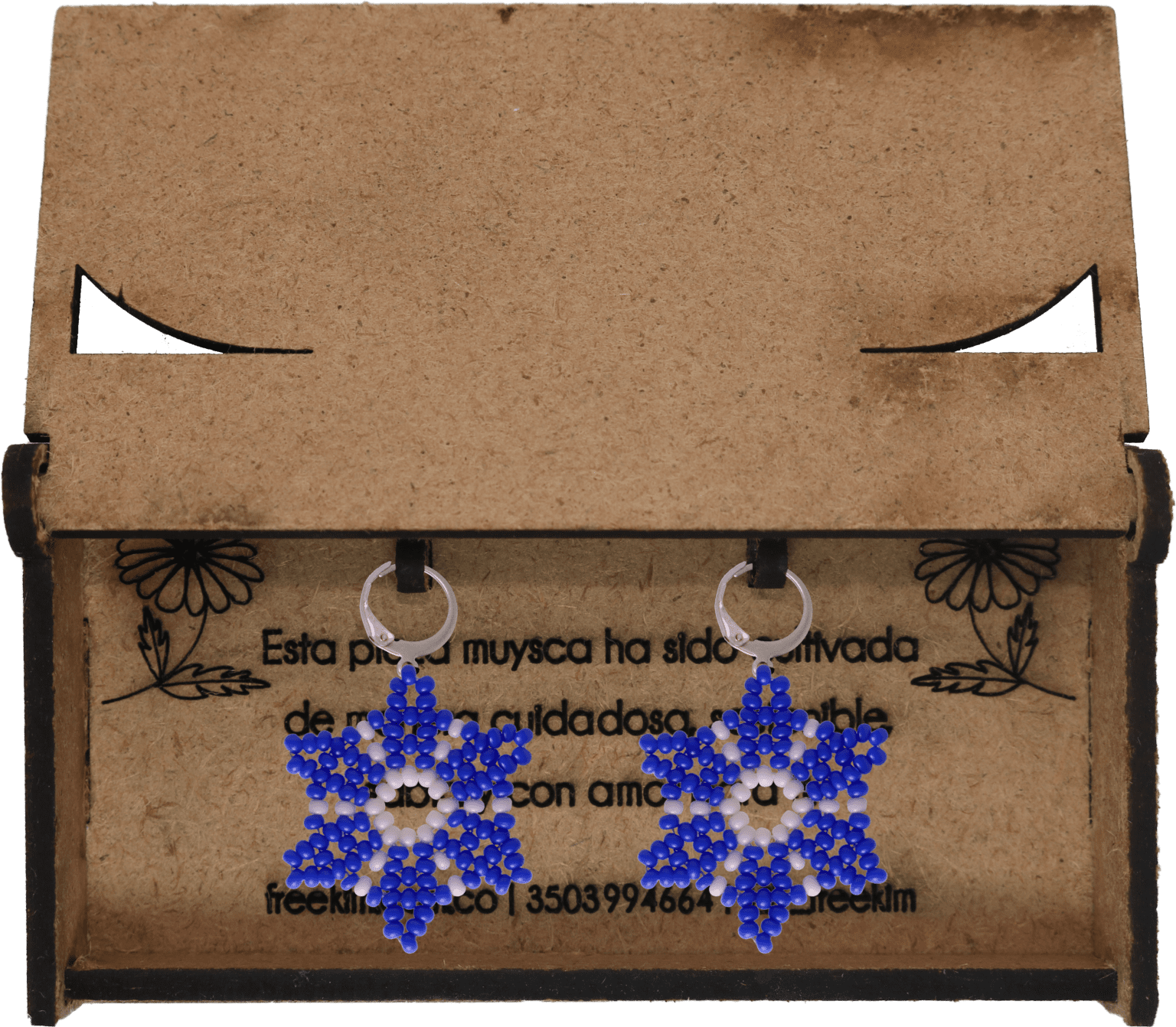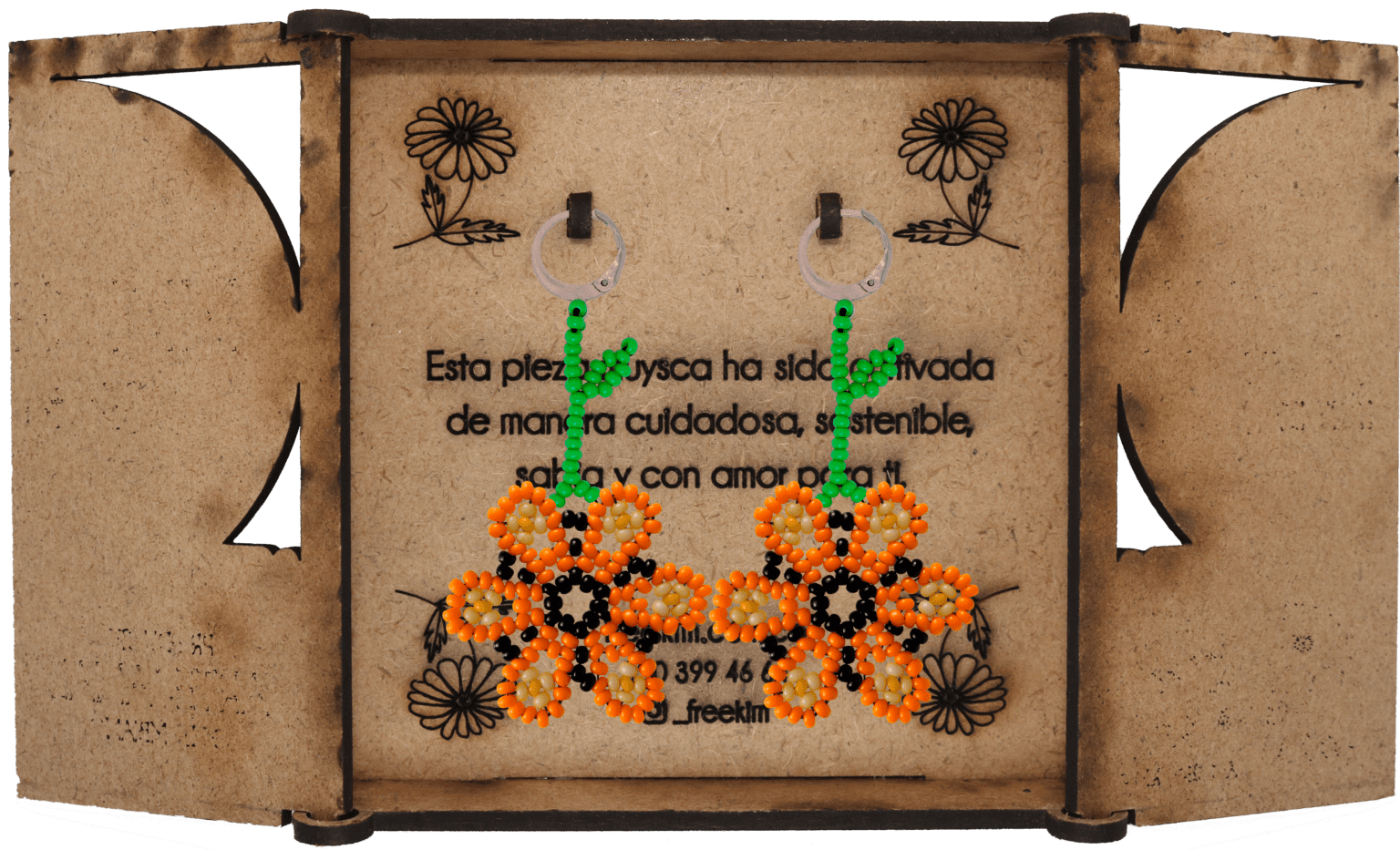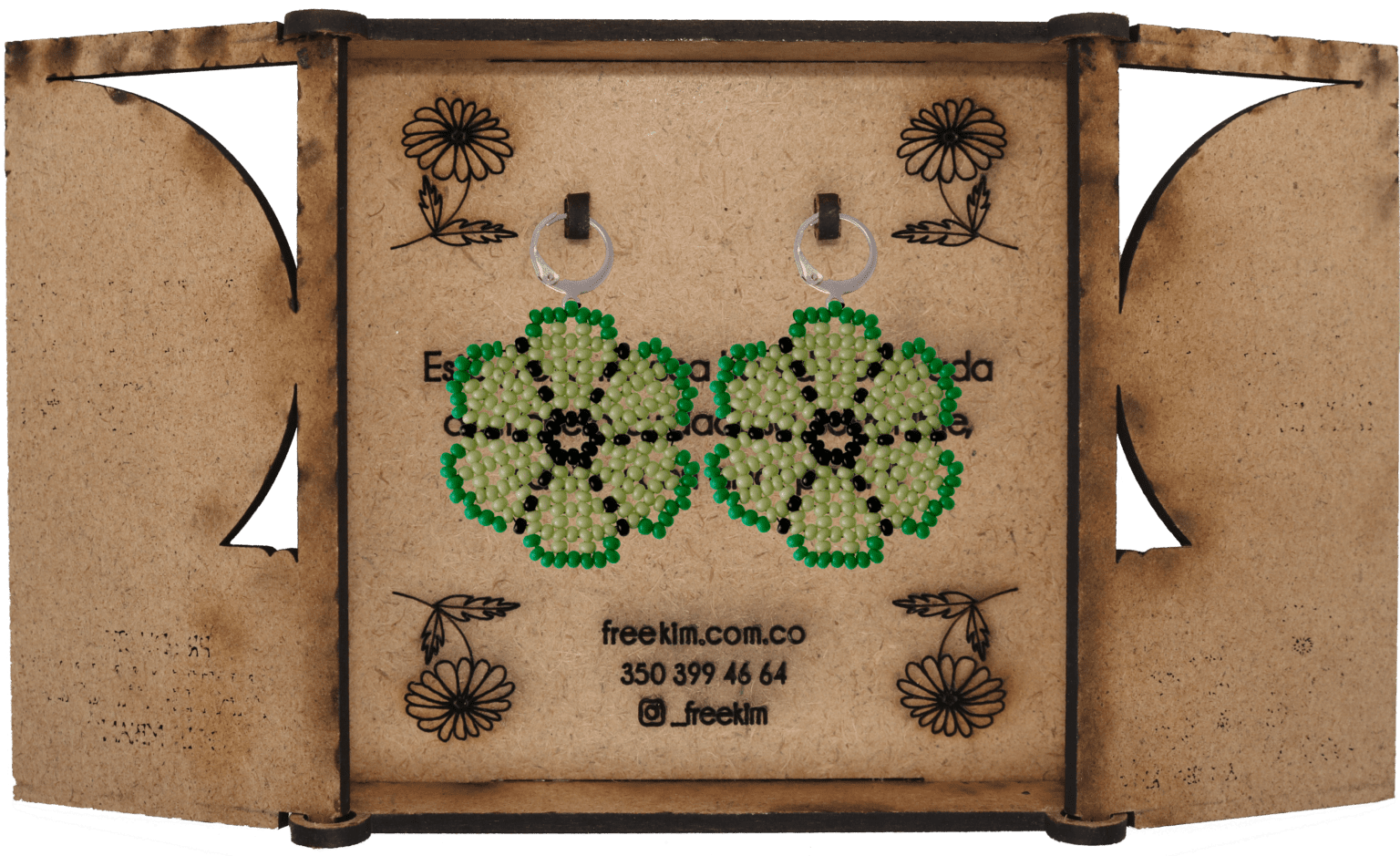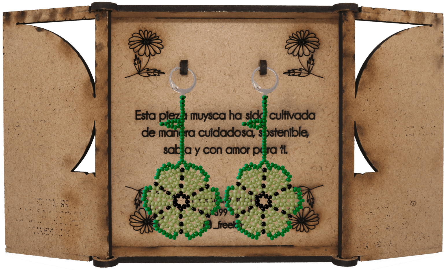 Ganchos en acero inoxidable, mostacilla checa, hilo resistente y cajas en madera.