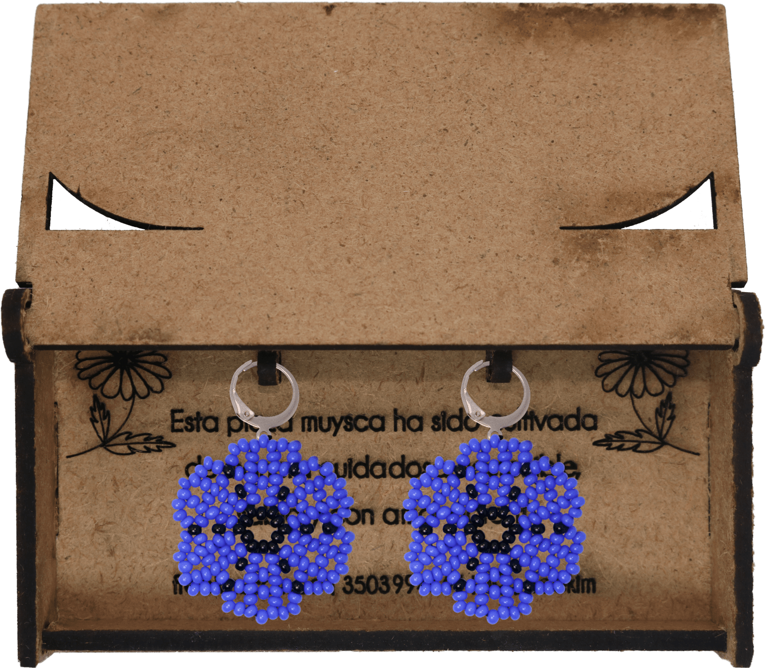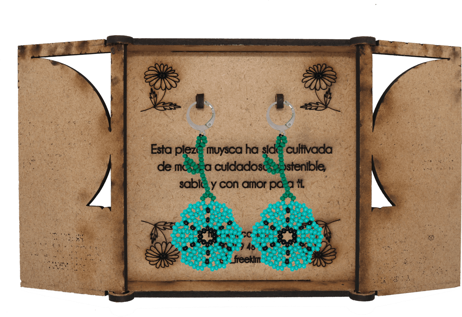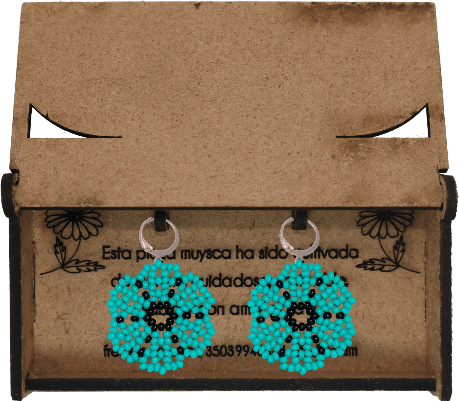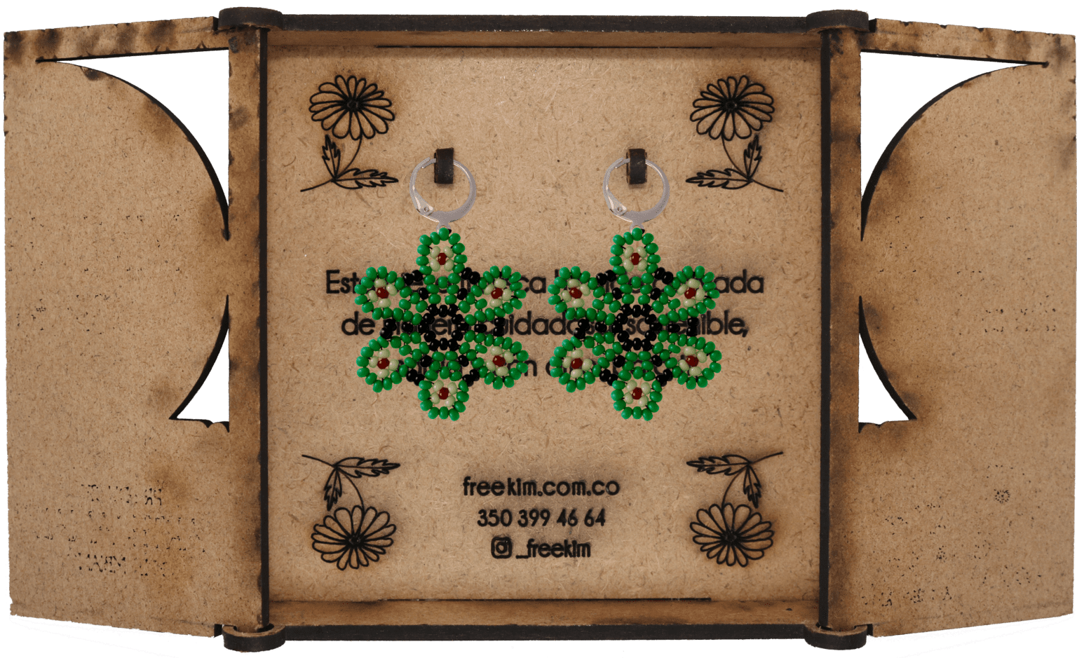 Ganchos en acero inoxidable, mostacilla checa, hilo resistente y cajas en madera.