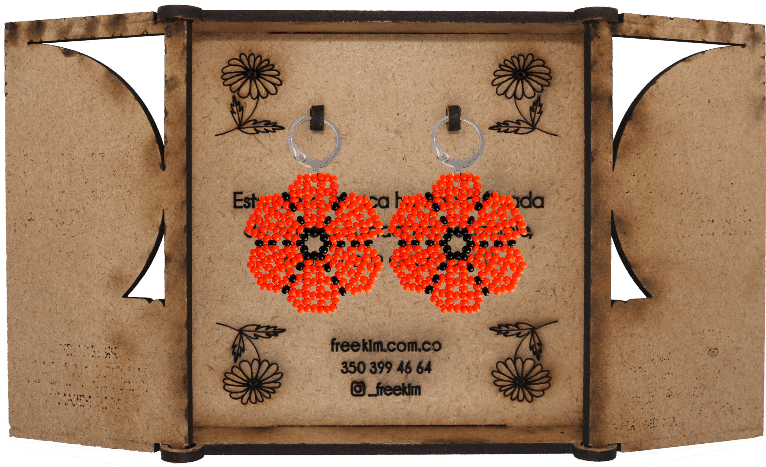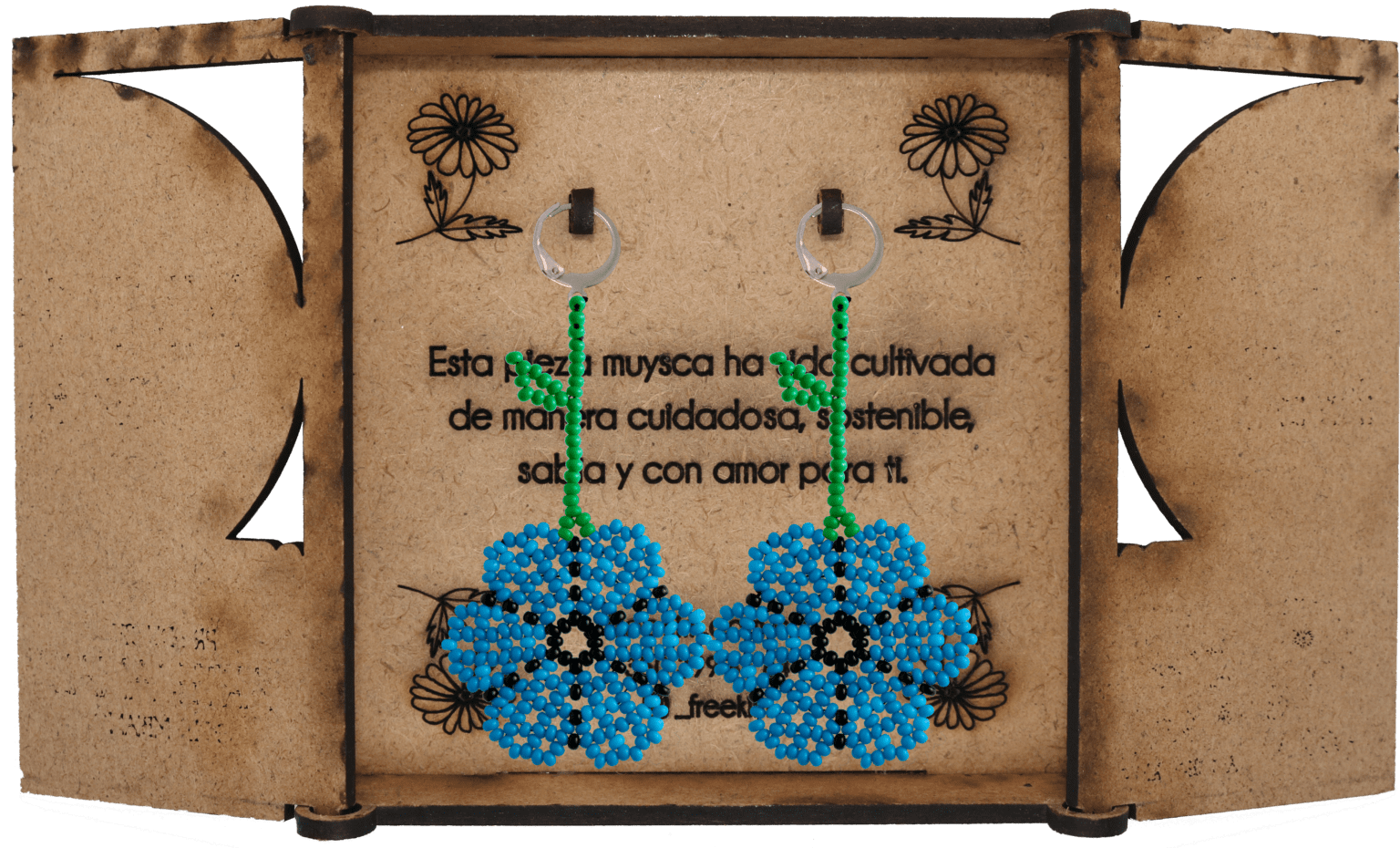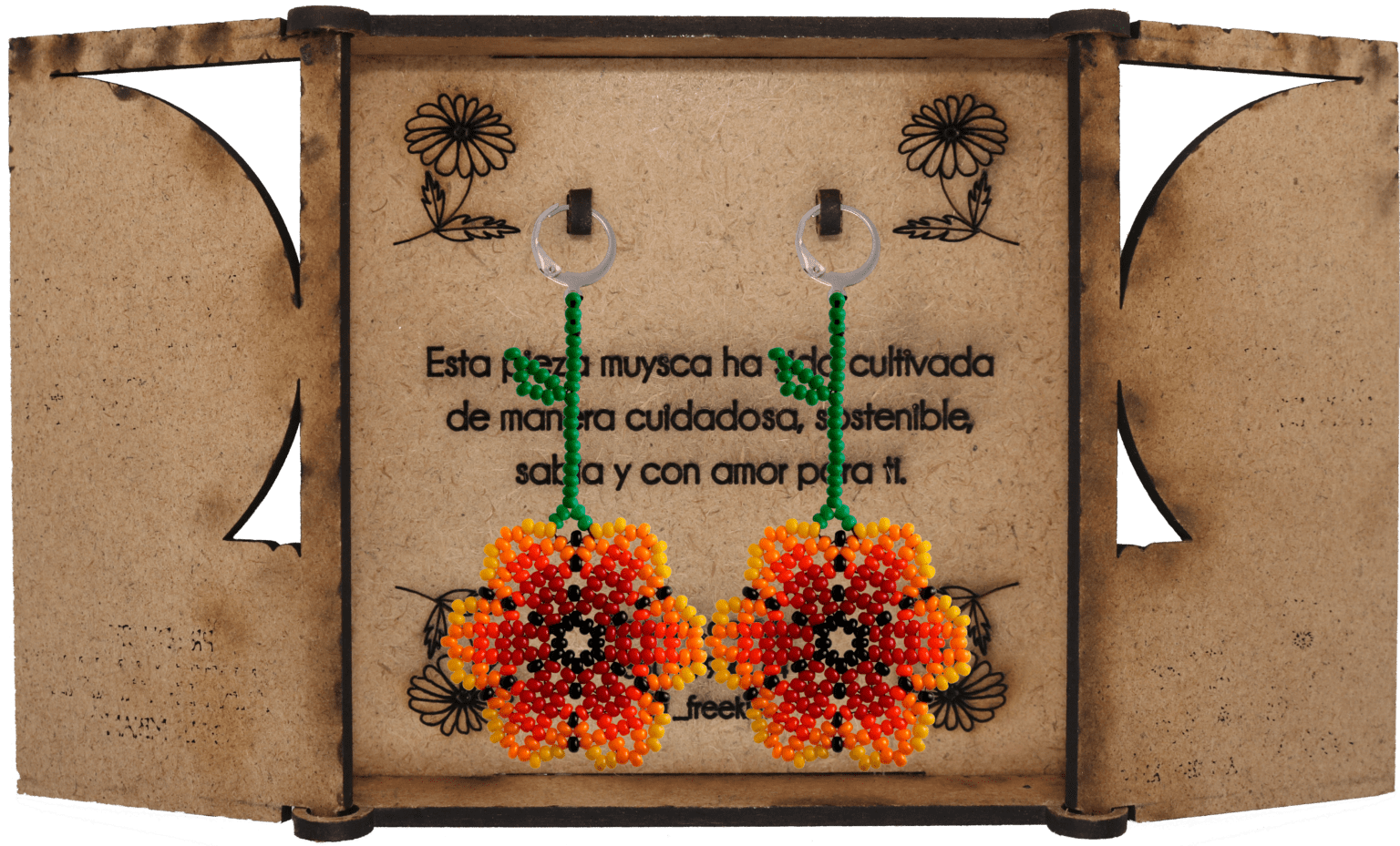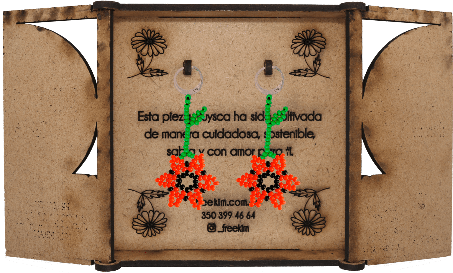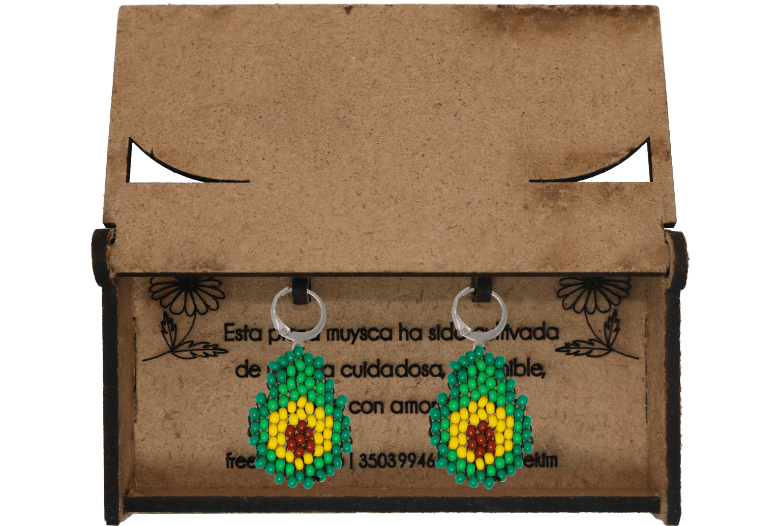 Ganchos en acero inoxidable, mostacilla checa, hilo resistente y cajas en madera.