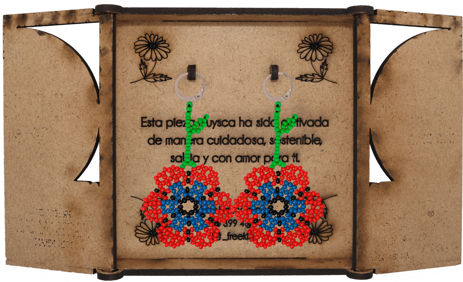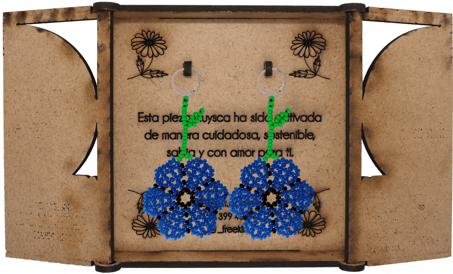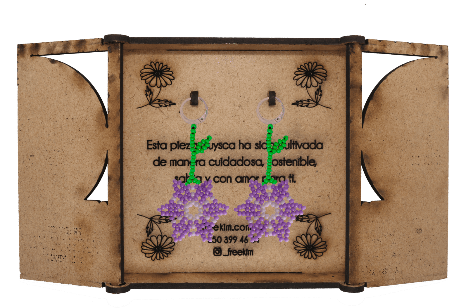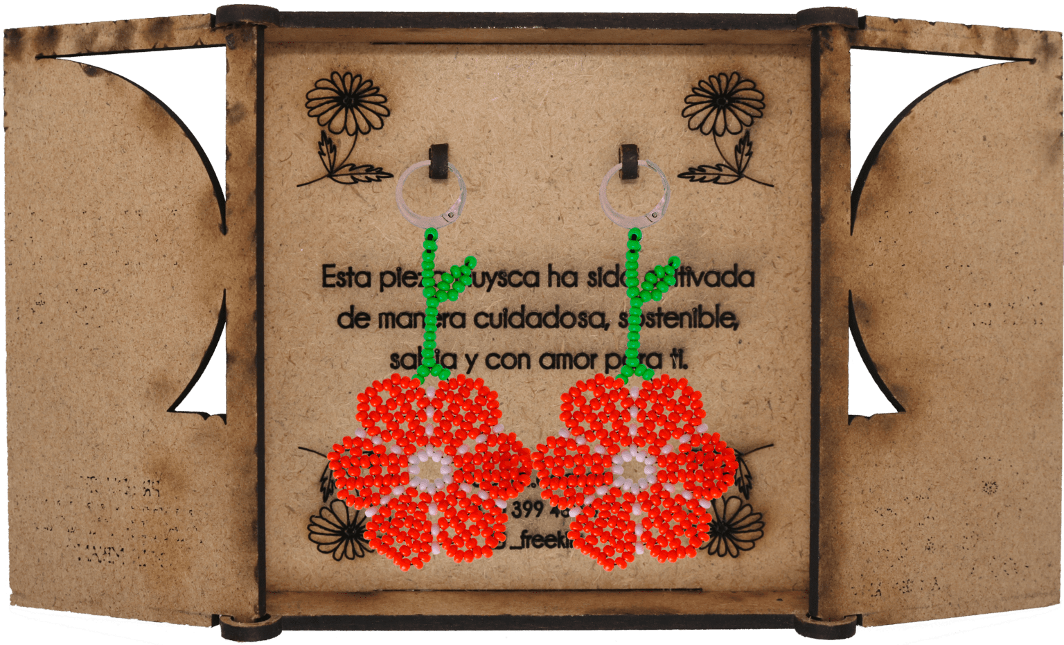 Ganchos en acero inoxidable, mostacilla checa, hilo resistente y cajas en madera.