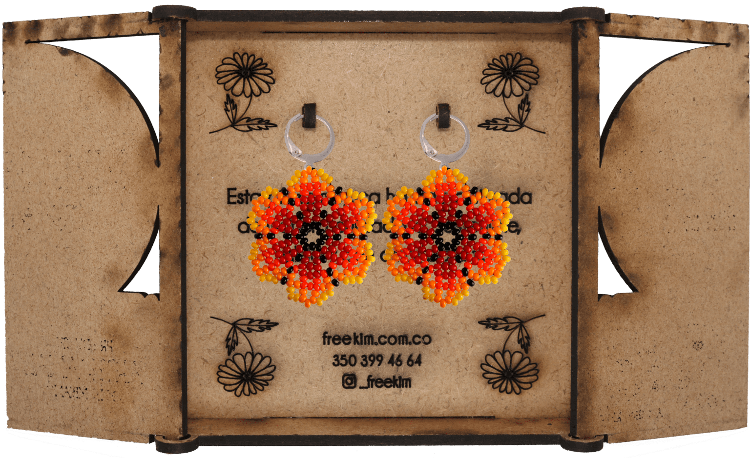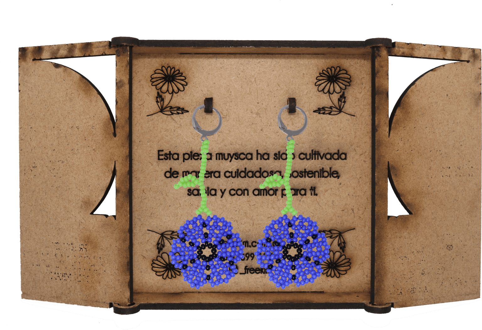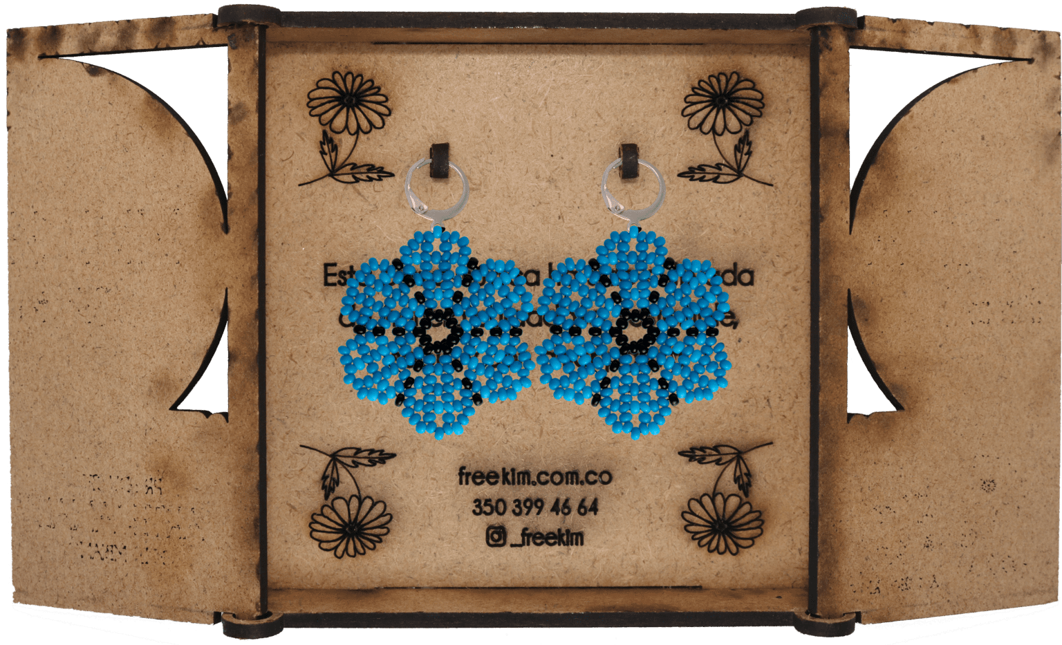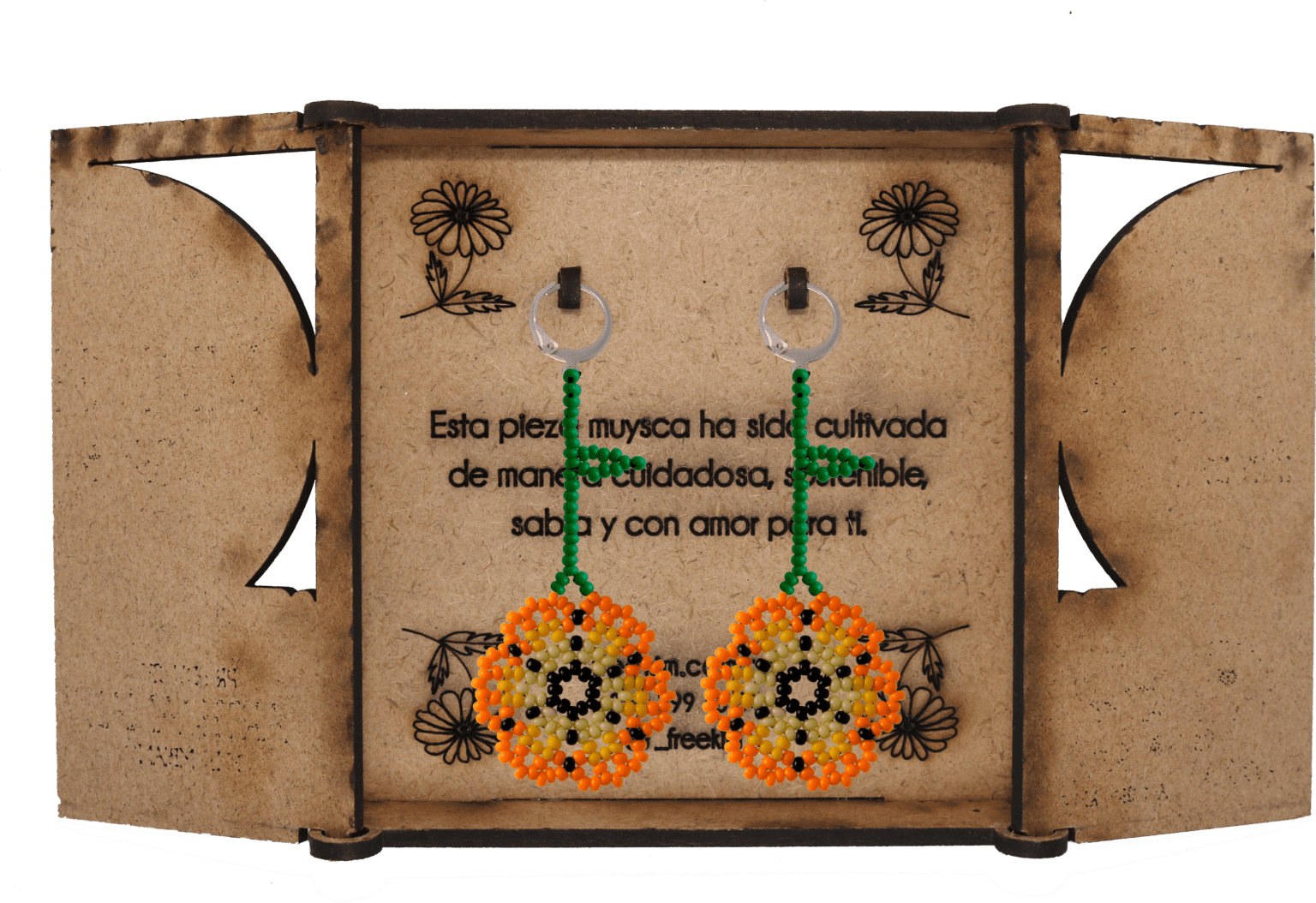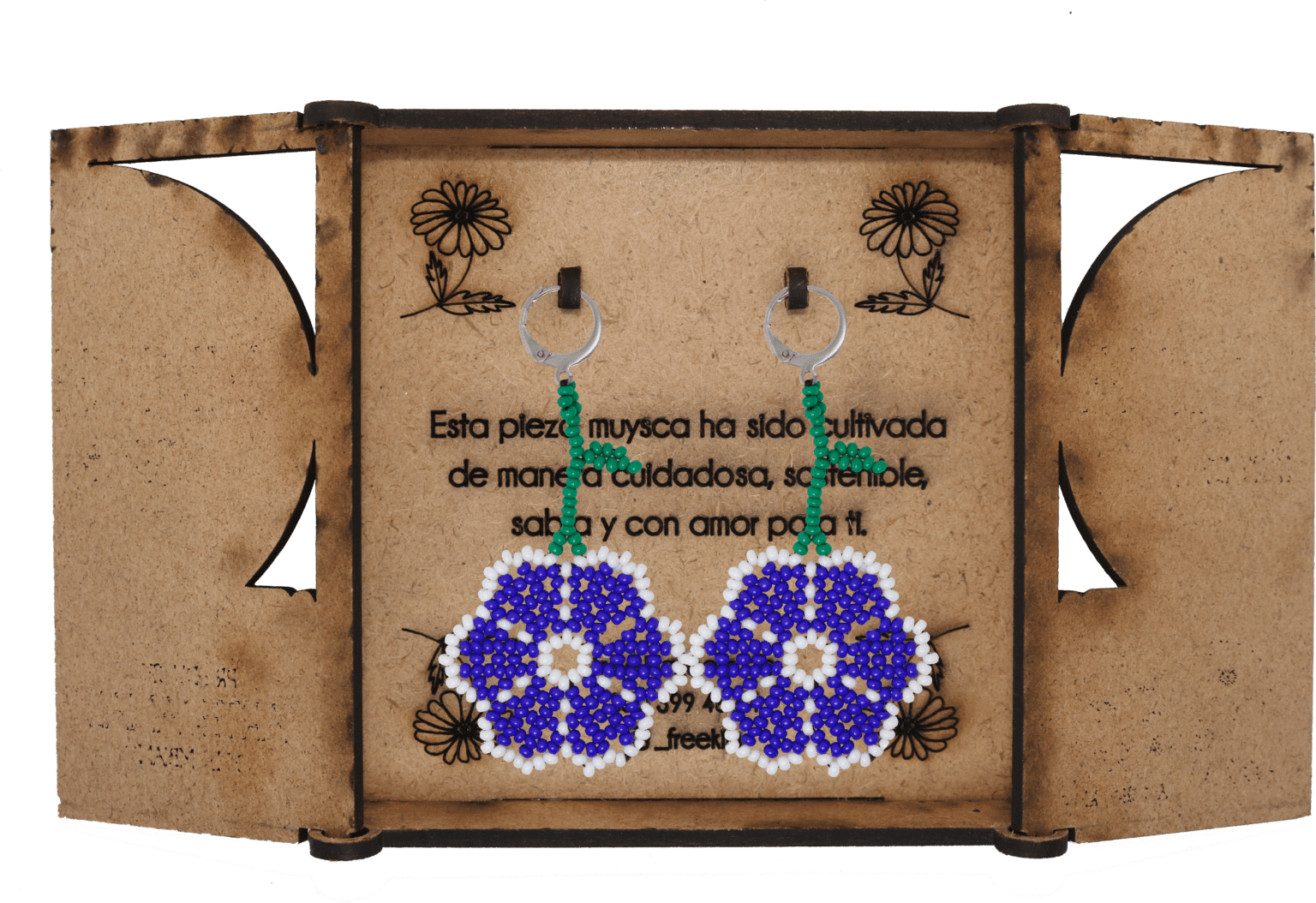 Ganchos en acero inoxidable, mostacilla checa, hilo resistente y cajas en madera.