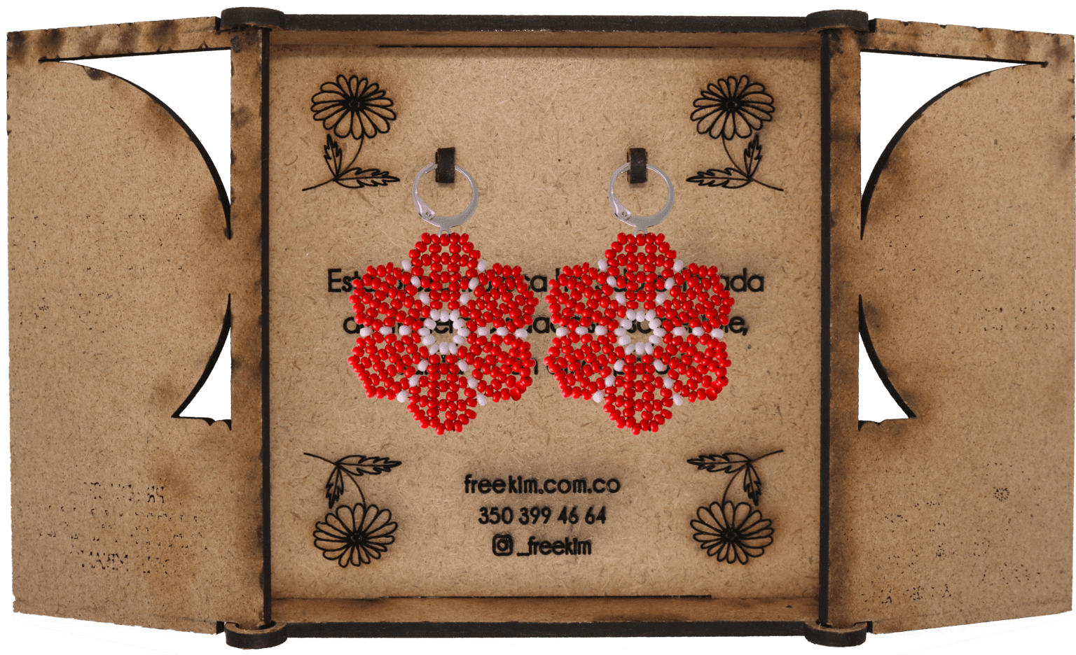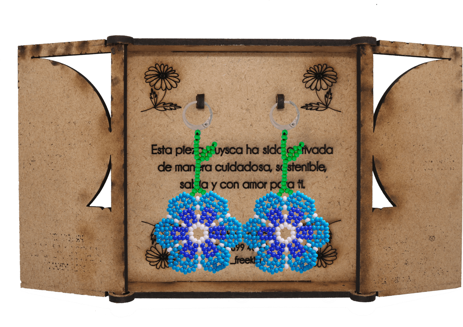 Ganchos en acero inoxidable, mostacilla checa, hilo resistente y cajas en madera.